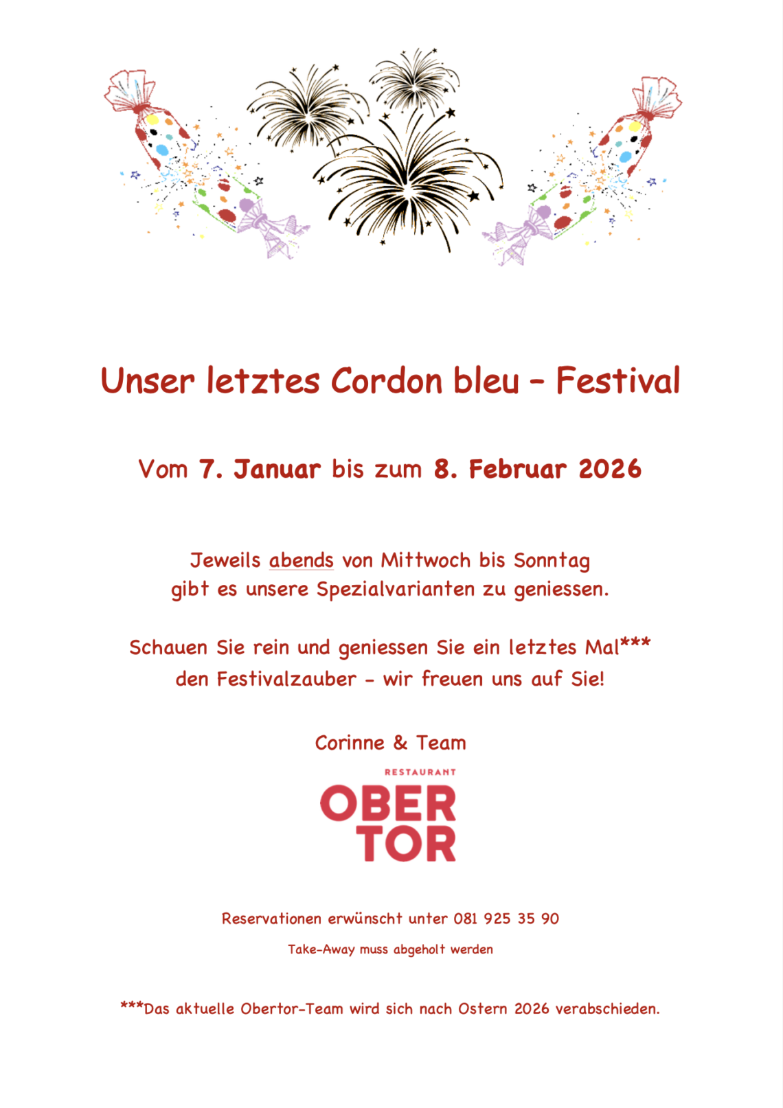 2026-01-03 / 1338x1894 px 2026-01-CB-Festival_Newsletter.png Telefon: 081 925 35 90 info@restaurant-obertor.ch Städtlistrasse 25 7130 Ilanz / Glion Öffnungszeiten: Mittwoch bis Sonntag abends ab 17.00 h Samstag & Sonntag 11.00-14.00 h Warme Küche: 11.30-13:30 h / 18.00-21.00 h Ruhetage Mo & Di
