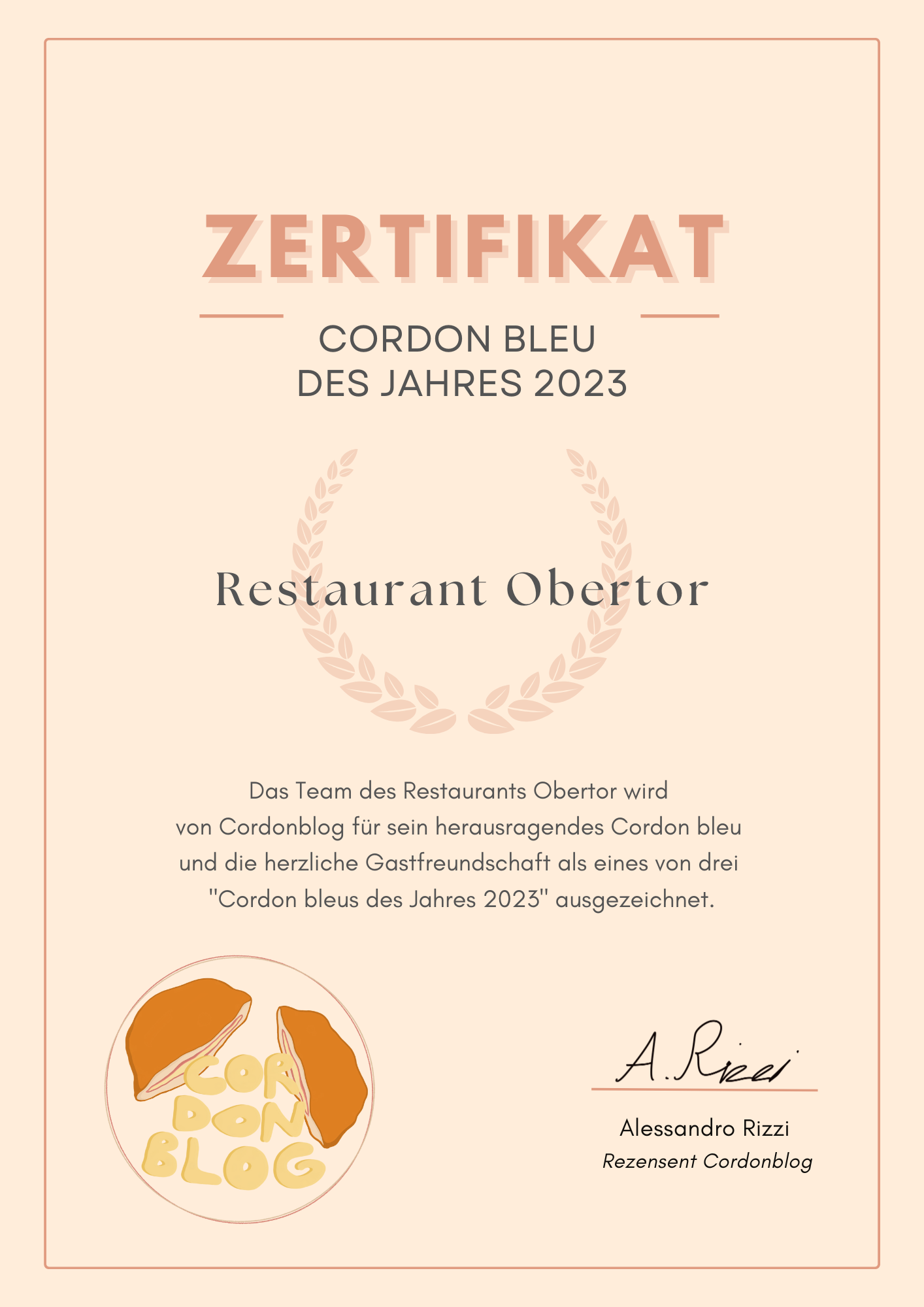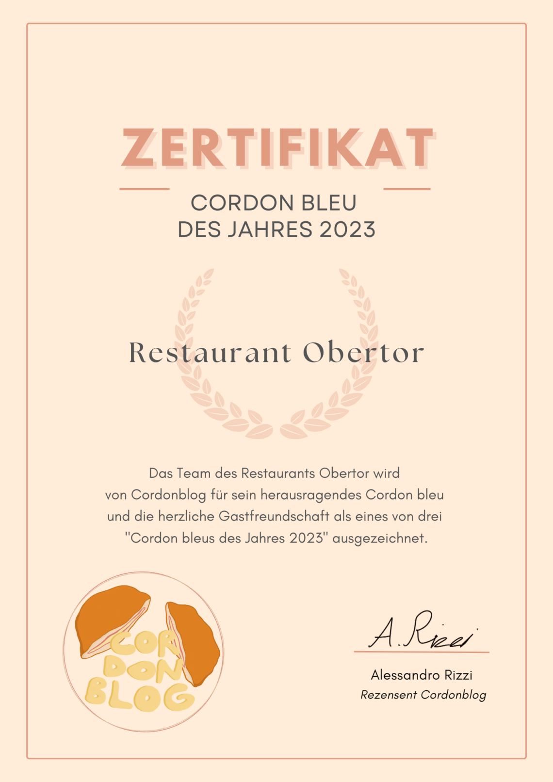 2024-01-23 / 1414x2000 px Zertifikat-Cordonblog.png Telefon: 081 925 35 90 info@restaurant-obertor.ch Städtlistrasse 25 7130 Ilanz / Glion Öffnungszeiten: Mittwoch bis Sonntag abends ab 17.00 h Samstag & Sonntag 11.00-14.00 h Warme Küche: 11.30-13:30 h / 18.00-21.00 h Ruhetage Mo & Di