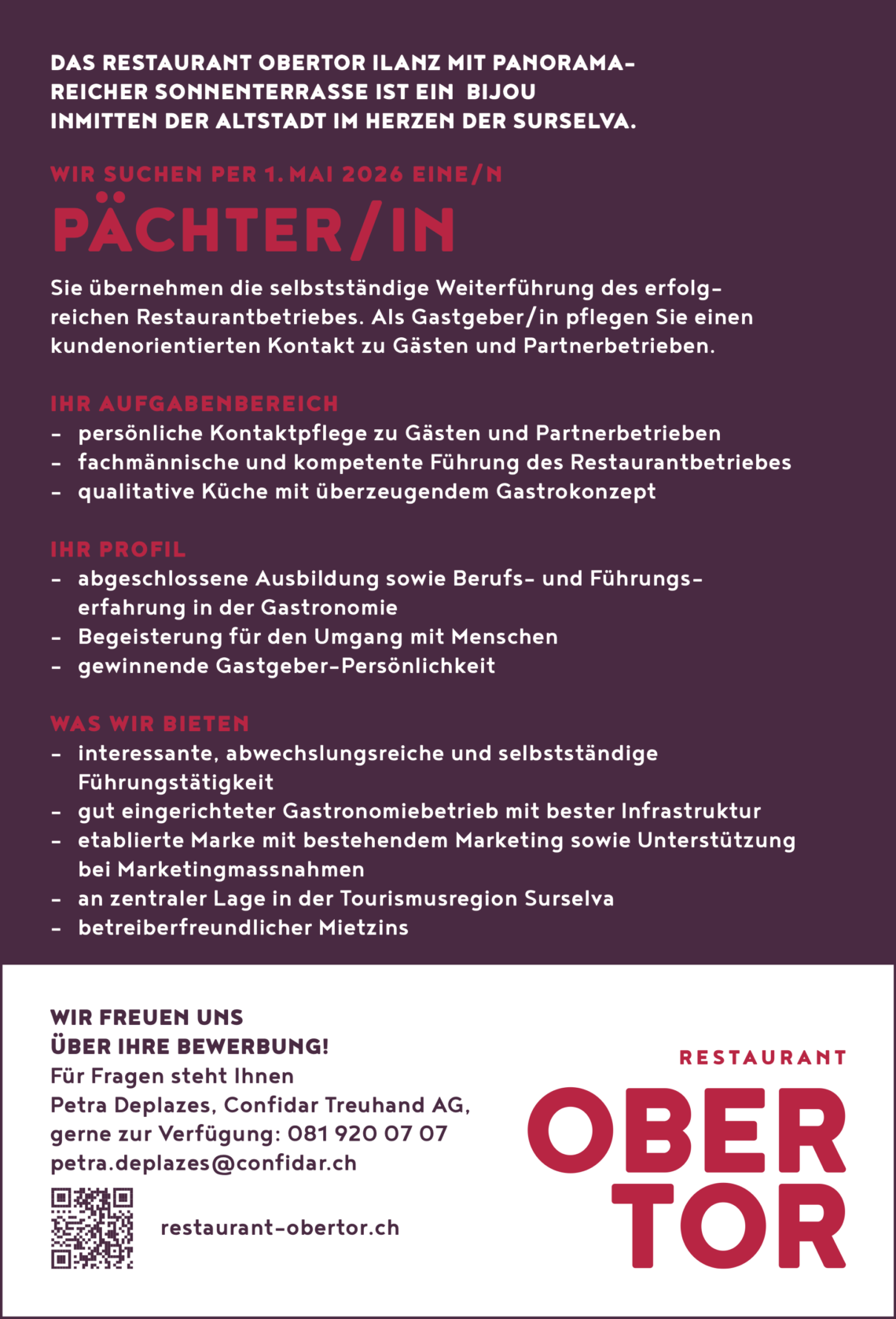 2025-09-03 / 1968x2897 px Inserat_Paechtersuche2025_RestaurantObertor_125x184mm_Druck.png Telefon: 081 925 35 90 info@restaurant-obertor.ch Städtlistrasse 25 7130 Ilanz / Glion Öffnungszeiten: Mittwoch bis Sonntag abends ab 17.00 h Samstag & Sonntag 11.00-14.00 h Warme Küche: 11.30-13:30 h / 18.00-21.00 h Ruhetage Mo & Di