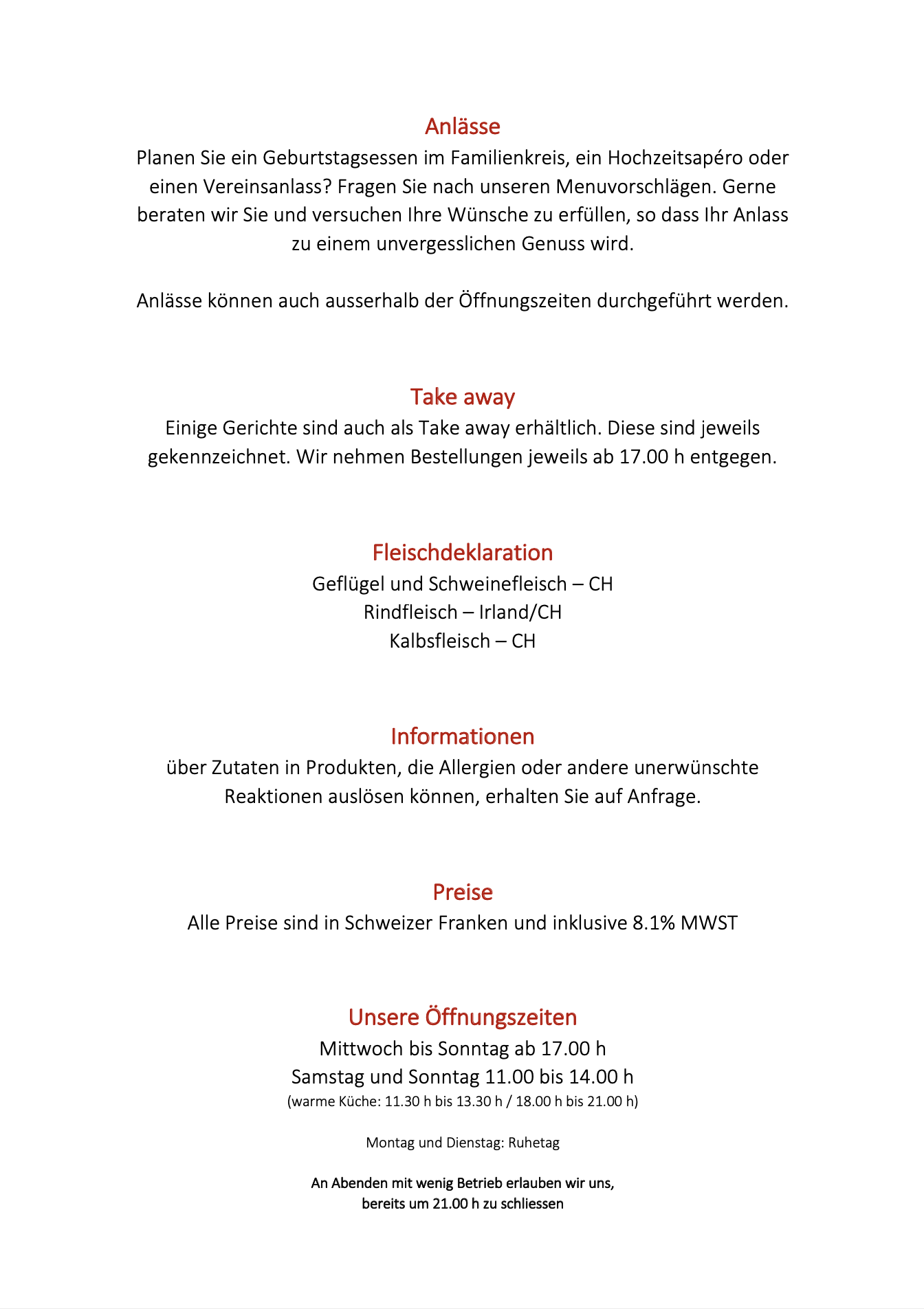 2024-01-01 / 1344x1904 px 2.-Seite.png Telefon: 081 925 35 90 info@restaurant-obertor.ch Städtlistrasse 25 7130 Ilanz / Glion Öffnungszeiten: Mittwoch bis Sonntag abends ab 17.00 h Samstag & Sonntag 11.00-14.00 h Warme Küche: 11.30-13:30 h / 18.00-21.00 h Ruhetage Mo & Di