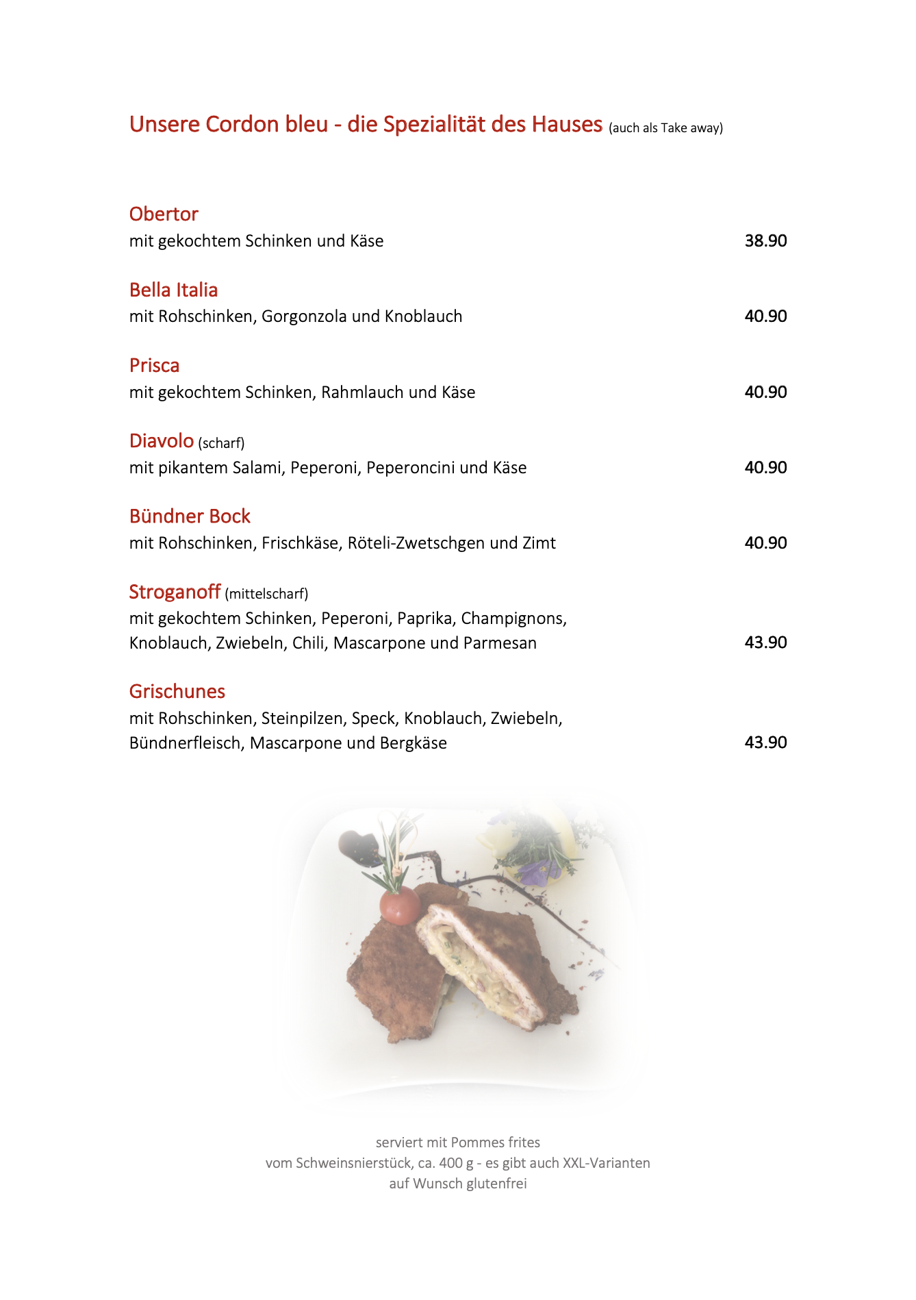2024-01-01 / 1338x1898 px Conrdon-bleu-1.png Telefon: 081 925 35 90 info@restaurant-obertor.ch Städtlistrasse 25 7130 Ilanz / Glion Öffnungszeiten: Mittwoch bis Sonntag abends ab 17.00 h Samstag & Sonntag 11.00-14.00 h Warme Küche: 11.30-13:30 h / 18.00-21.00 h Ruhetage Mo & Di