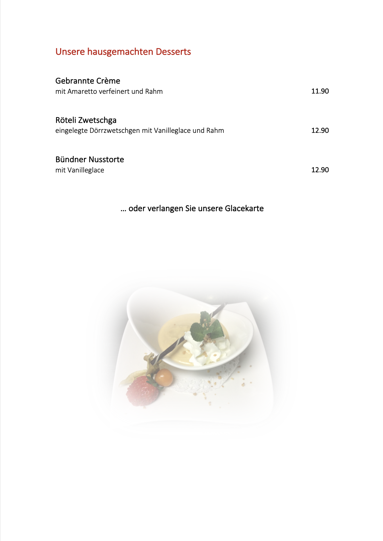 2024-01-01 / 1346x1898 px Desserts.png Telefon: 081 925 35 90 info@restaurant-obertor.ch Städtlistrasse 25 7130 Ilanz / Glion Öffnungszeiten: Mittwoch bis Sonntag abends ab 17.00 h Samstag & Sonntag 11.00-14.00 h Warme Küche: 11.30-13:30 h / 18.00-21.00 h Ruhetage Mo & Di